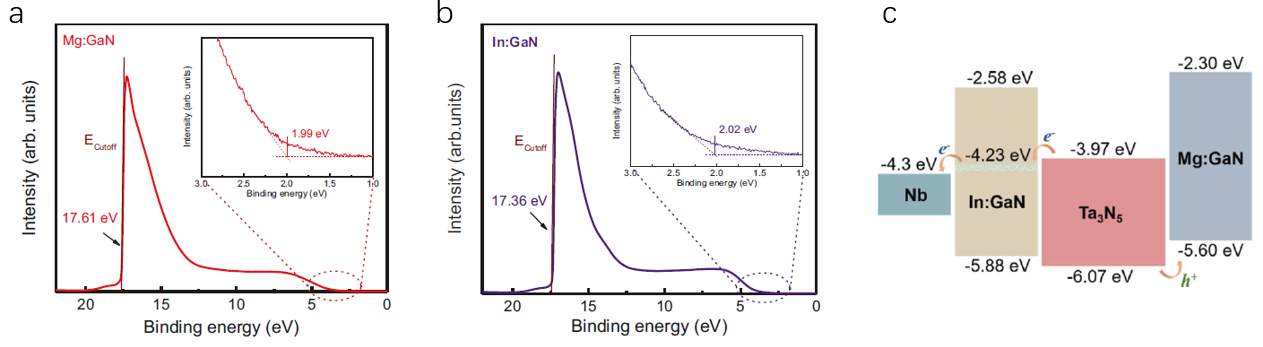 图1 (a) Mg:GaN/Nb的UPS谱图。(b) In:GaN/Nb的UPS谱图。(c) In:GaN/Ta3N5/Mg:GaN薄膜的能级排列示意图。(UPS数据由PHI 5000 VersaProbe III搭载的UPS配件测得)