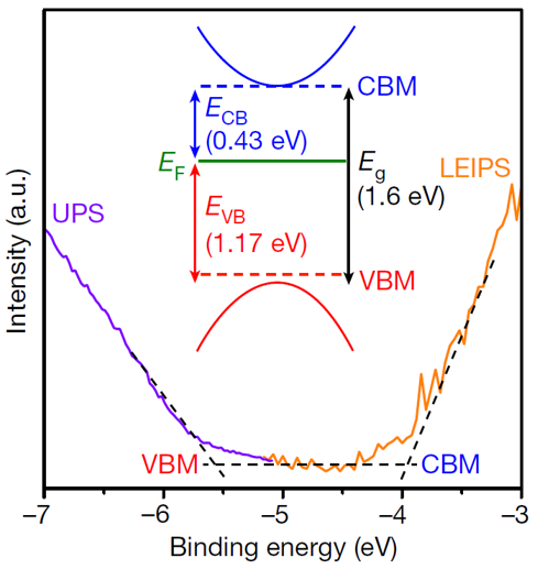 图2. UPS结合LEIPS表征单层qHP C60纳米片的电子能带结构。Eg为带隙;ECB表示CBM与EF的能级差;EVB表示VBM与EF的能级差。