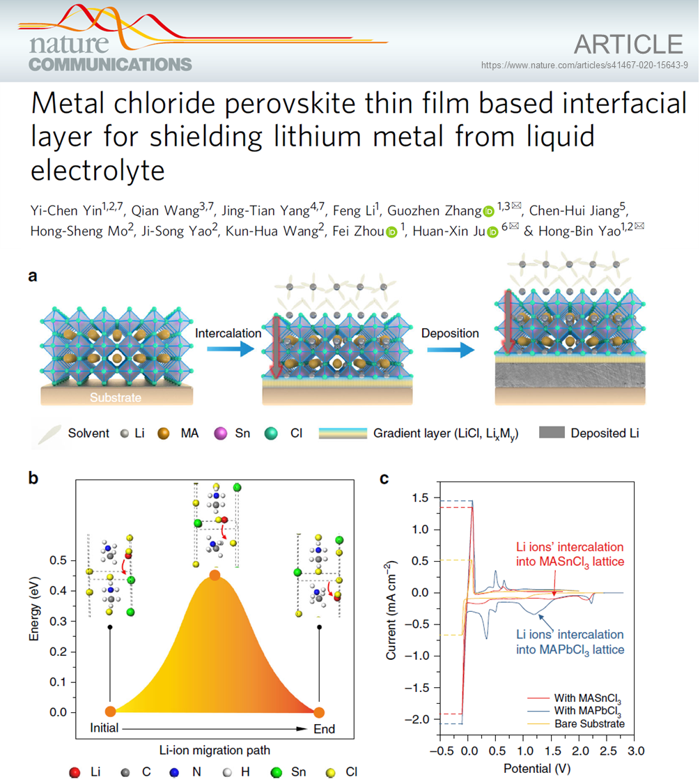 Recently, the team of Professor Yao-Hongbin, School of Chemistry and Materials Science (SCMS) of University of Science and Technology of China (USTC), in collaboration with Associate Professor Zhang, Guozhen and Dr. Ju, Huanxin of PHI CHINA Nanjing Laboratory. They have made significant progress in the construction of metal halide perovskite lithium conducting layers and stabilizing lithium metal batteries. The team of Prof. Yao utilized the advantages of chlorine-based metal halide perovskite wide band gap, good film formation and simple preparation to develop a gradient lithium conductive layer based on the metal halide perovskite. Therefore, the isolation of the lithium metal anode and the electrolyte is achieved, which greatly improves the cycle stability of the lithium metal battery. The result was published in Nature's comprehensive journal Nature Communications under the title "Metal chloride perovskite thin film based interfacial layer for shielding lithium metal from liquid electrolyte" (DOI: 10.1038 / s41467-020-15643-9).