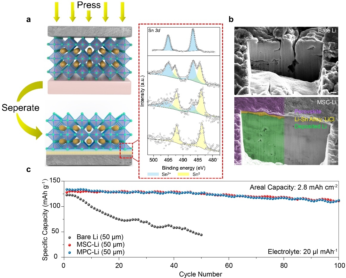 Furthermore, the researchers have developed a convenient solid-phase transfer method to transfer the high-quality chlorine based perovskite (MASnCl3 and MAPbCl3)films prepared by spin coating method to the surface of lithium foil in situ, forming a lithium conducting layer with gradient structure (Fig. 2a). The metal halide perovskite lithium conducting layer can improve the interface between electrolyte and lithium metal, achieve dense lithium deposition and stripping, and avoid the growth of lithium dendrite and the pulverization of lithium metal electrode (Fig. 2b). The final electrochemical cycle test of lithium metal full cell shows that under the protection of metal halide perovskite conductive lithium layer, even under the strict conditions of poor lithium (50 μm) and limited electrolyte (20 μ L mah-1) and 2.8 mAh cm-2 surface capacity, the capacity of lithium cell without protective layer has been reduced to 40% after 50 cycles (Fig. 2 c).