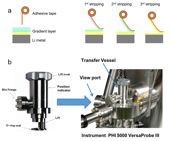 In the process of XPS characterization of “perovskite-alloy-lithium metal” gradient interface structure, the partial reduction of B-site ions in ABX3 perovskite will be caused by depth profiling, which makes the depth XPS characterization based on Ar ion sputtering unable to truly and objectively reflect the change of the valance state of B-site elements at different depths (Fig. 3a,b). In this regards, using mechanical stripping method, the chemical composition of the interface layer at different depths are exposed. The researchers used Kapton tape for mechanical stripping under the protection of inert atmosphere in glove box (Fig. 4a). At the same time, the prepared samples are transferred from the glove box to the XPS experimental device of PHI China Nanjing Laboratory though the inert atmosphere transfer chamber. The environmental sensitive samples in the whole sample transfer process are always under the protection of inert atmosphere, ensuring the reliability of the experimental results (Fig. 4b).